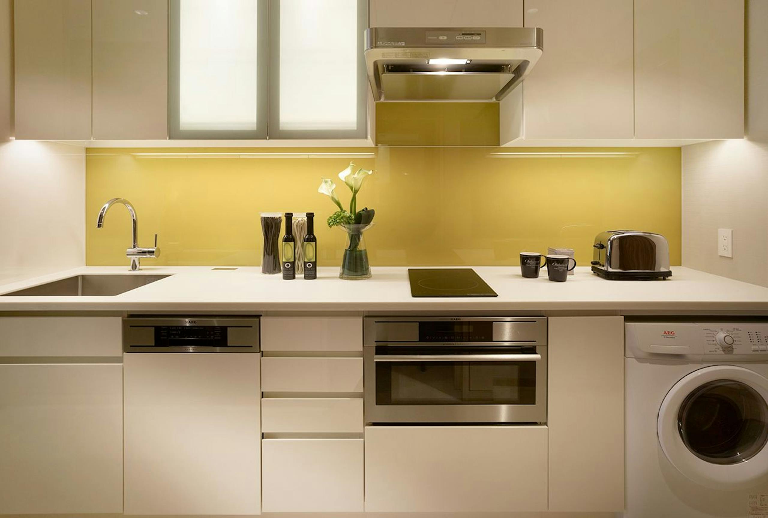 全室に本格的なIHキッチン、オーブン、冷蔵庫、電子レンジ、調理器具、そして洗濯乾燥機まで完備されています。